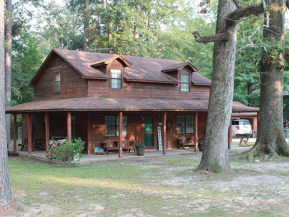 Beautiful setting with 2 story brown cedar country house situated on 3 Acres; House features den with wood burning fireplace with insert; Wrap around porch in front and 2 sides; Separate garage with cover to get into house with storage behind that could be used for office or school room; 3 bedrooms and 2 baths upstairs; Kitchen features gas range, large refrigerator, and dishwasher; 30 x 40 RV shed with concrete floor; Yard ornaments do not stay