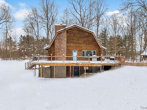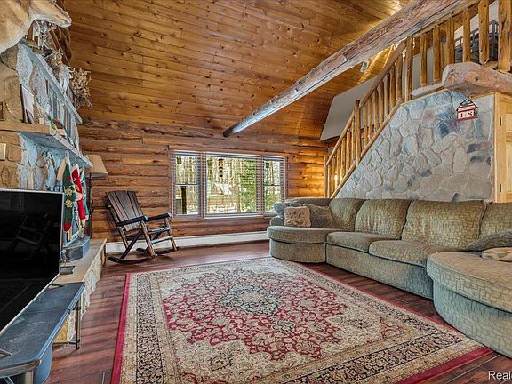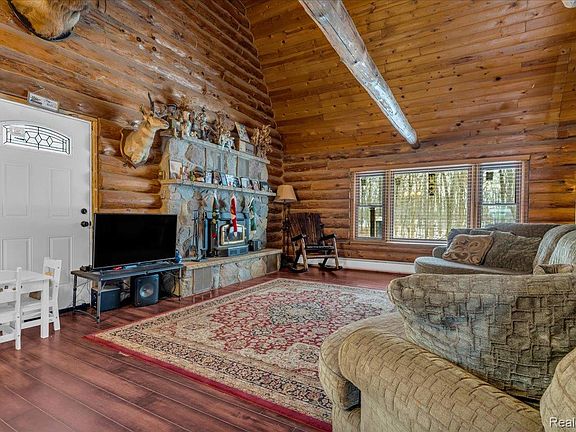 Escape to your own private retreat on 5 beautiful acres with this stunning log cabin–style home! New Wallside Windows 24, boiler system 22, stove 24, washer 25, H20 softener system 25. Tucked away for ultimate privacy, this one-of-a-kind property offers rustic charm with modern comforts and exceptional outdoor living., A huge wraparound porch invites you to relax and take in the peaceful views of the surrounding landscape. Inside, you’ll find an open floor plan with soaring ceilings and striking log interior walls with natural stone fireplace that creates a warm, inviting atmosphere. The spacious kitchen features stainless steel appliances, ample cabinetry, and plenty of room for gathering and entertaining. The home offers three bedrooms and two bathrooms, including a lofted primary suite with private ensuite overlooking the main living area. The walk-out lower level expands your living space with a large recreation room and abundant storage—perfect for entertaining, hobbies, or guests. Outside, enjoy summer fun in the above-ground pool or unwind by your private pond. A detached 24 x 36 garage and workshop with a second floor provides exceptional space for vehicles, equipment, or creative projects. For your energy features enjoy the warmth heat of an outdoor wood boiler /LP gas system to heat the home and water heater to assure affordable heating costs along with a natural wood fireplace and wood stove in the basement as well. Whether you’re seeking a full-time residence, weekend getaway, or vacation rental opportunity, this private log home delivers space, character, and serenity in a truly special setting.