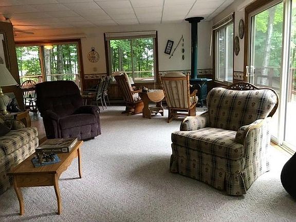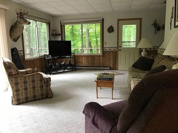 Wonderful chalet style home on a lovely wooded lot near the golf course. This 3BD, 2BA home features a finished LL walk-out family room w gas log free standing stove and full bath. Some built-in features great for a bar area. Main floor has open concept living rm/kitchen/dinette has 2 patio doors that open out to the wraparound deck. Master bedroom & full bath, upper has 2 more large bedrooms. All new windows in 2018.