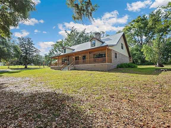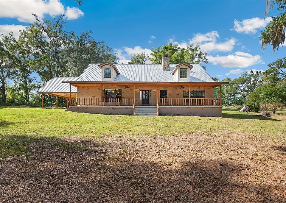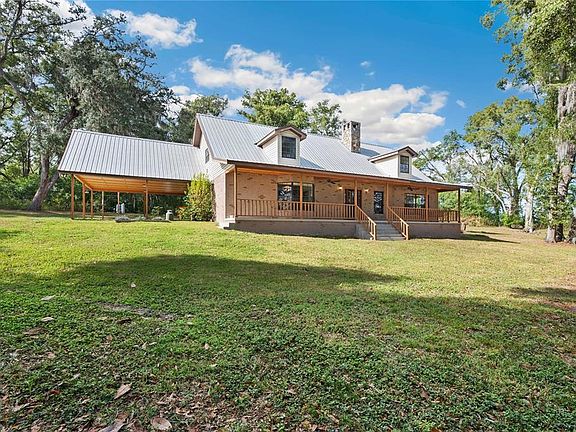 One or more photo(s) has been virtually staged. Welcome to 14835 Ramsey Road, a beautifully maintained one-owner home nestled on nearly 4 picturesque acres adorned with grand oak trees and a long, private paved driveway. Purposefully designed for function, comfort, and timeless living, this property offers the perfect blend of privacy and convenience in one of Dade City’s most desirable rural-residential corridors. Step inside to an expansive living room where a floor-to-ceiling stone wood-burning fireplace rises to meet the cathedral ceilings, creating a warm and inviting centerpiece. The thoughtful layout features 3 bedrooms, 2.5 baths, a dedicated home office, formal dining room, breakfast nook, and a versatile flex space perfect for a playroom, second office, or hobby room. The huge kitchen is a dream for cooking and gathering—offering more counter space than you can imagine, a newer gas oven/range, newer dishwasher, an impressive 13×6 walk-in pantry, and a charming bay-window breakfast nook with views of the sweeping property. The primary suite provides a peaceful retreat with beautifully custom-designed soaking tub, walk-in shower, separate water closet, and his-and-hers walk-in closets. Upstairs, you’ll find two oversized bedrooms, a shared full bath, abundant attic storage, and a beautiful catwalk balcony with built-in bookcases. Outside, a 24×24 attached carport includes attic storage above and a dedicated 10×10 workshop, offering ideal space for tools, projects, or hobbies. The full-length front porch, complete with a classic wooden swing, invites slow mornings, evening sunsets, and year-round enjoyment. With nearly 4 acres, this property provides endless possibilities: space for animals, gardening, recreation, or simply enjoying the tranquility of country living. All while being just minutes to Dade City, Blanton, San Antonio, and within easy reach of Wesley Chapel, Tampa, Brooksville, and Zephyrhills. Additional highlights include a newer metal roof and a clean 4-point inspection report available upon request. This well-cared-for home is ready for your personal vision; acreage, privacy, and location all wrapped into one rare offering.