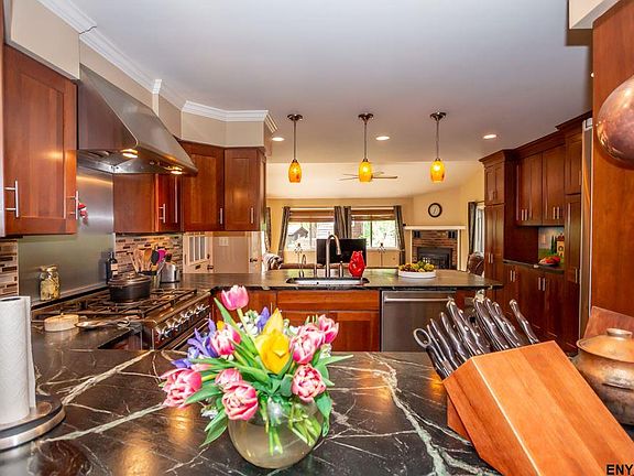 Wonderful Guilderland location close to the Pine Bush Preserve (forever wild, walking trails/bike path). Gourmet kitchen designed by Paul Perry Kitchens includes, Brazilian soap stone counters, cherry cabinets, commercial stove, deep single sink with on-demand hot water dispenser. More features include 2 fireplaces, new windows, carpet and fresh paint, finished basement and whole house generator. Expansive master suite with his and her walk-in closets.
