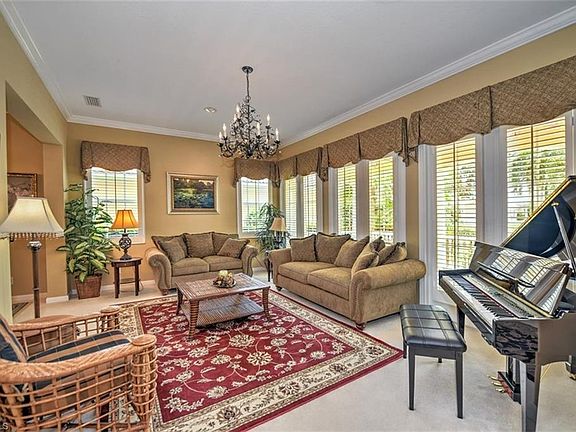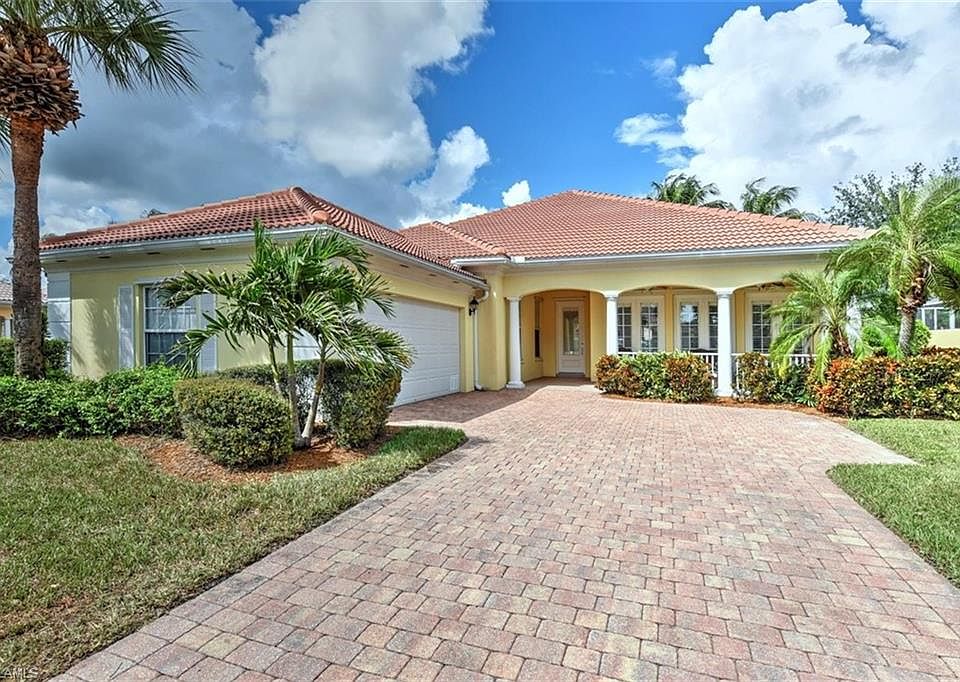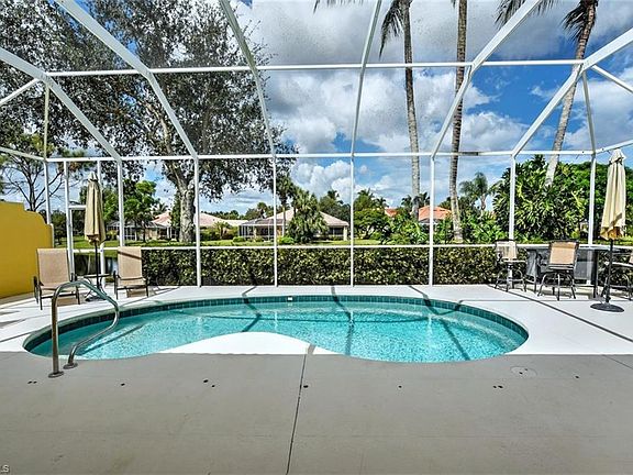 Beautifully FURNISHED Carlyle Model with POOL and LAKE Front views. Home has been meticulously maintained by owner including NEW ROOF (2020), NEW AC (2020), New Appliances (2020), New Pool Pump (2020). Caryle is a popular model with welcoming front porch, a spacious 2500+ floor plan, and large pool and screened lanai area, and side entrance garage. Updates include Plantation shutters throughout, crown molding, extra lighting and new fans. Home is located on a cul-du-sac with extra paved parking and green space down the left side of the property. Low fee of $359 a month includes Cable, Internet, Lawn Care, gated entrance and community clubhouse, tennis, play area, and exercise room. Terrific Bonita location close to the beaches, fine dining, shopping, arts and entertainment, medical, international airport and quick access to I-75.