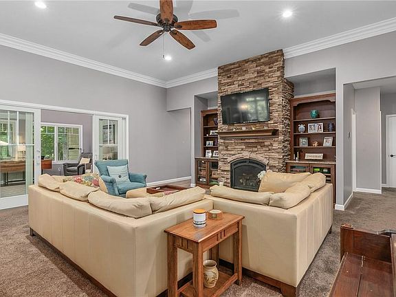 GORGEOUS Waterfront property on Lake Sara!!! Serene & Private. LIKE NEW 4BR/2.5 BA home nestled in the trees. The welcoming entry leads to the Central Living Room w/10' ceilings, beautiful crown molding, and a stone fireplace!!! The kitchen features beautiful cabinetry w/ Quartz counters and a BIG island with Boos counter top. There is a big laundry room off the kitchen. LOTS OF WINDOWS AT the eating area and family room to view the woods and lake. The Master Bedroom is privately located w/ a BIG walk-in closet, and a BIG BATH w/ double vanity and walk-in shower. There are 3 more nice sized bedrooms. Outside is a nature land w/ a firepit under the trees overlooking the lake. You and your guests will really appreciate the EASY LAKE ACCESS via a private lane from the house to the boat dock! The dock features 2 slips w/ electric boat hoists, a nice swim deck, and a HUGE SUNDECK on top! AND a sand beach area for launching kayaks, swimming, etc.