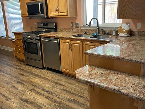 Very clean family home with lots of light and space, single story. Large kitchen with appliances, spacious living room, primary bedroom has en suite bathroom. Laundry room with washer/dryer, attached double garage. Sunny front deck, shady covered back deck, fenced yards. Small dogs and cats ok upon approval. 12 month lease, then monthly. Smoking outside only. Tenant pays utilities.