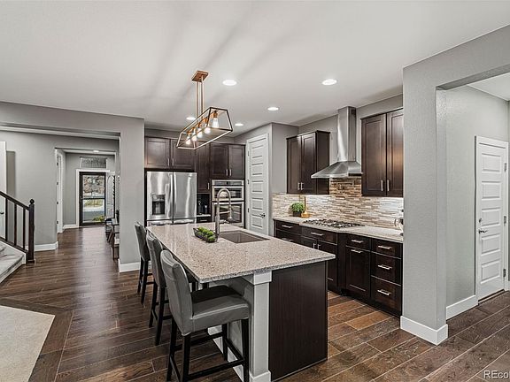 Priced Below Market Value for a Quick Sale! Nestled in the prestigious Heirloom neighborhood of Parker, Colorado, 14845 Haley Avenue is a stunning 4-bedroom, 3-bathroom home that combines modern elegance with thoughtful design. Built in 2015, this spacious 4,065-square-foot residence features a walk-out basement and a professionally landscaped yard that backs to open space and a serene pond. The main floor boasts hardwood floors, custom interior paint, 8-foot doors and recessed lighting throughout. The gourmet kitchen is a chef's dream, complete with quartz countertops, espresso soft close cabinets with crown molding, a 4-seat island with pendant lighting, and top-of-the-line stainless steel appliances, including a 5-burner gas cooktop and pot filler. The open family room features a gas fireplace with a stone surround, while the private main-floor study is enclosed with elegant French doors. A guest suite with an adjacent 3/4 bathroom adds convenience and comfort. Upstairs, the primary suite offers a tray ceiling, crown molding, and a luxurious 5-piece bath with a soaking tub, dual vanities, and his-and-hers walk-in closets. Two additional bedrooms share a Jack-and-Jill bathroom, and the second-floor laundry room includes a utility sink and cabinets for added functionality. The 1,387-square-foot walk-out basement is ready for your custom touch, and the 3-car tandem garage provides ample storage. The backyard is an entertainer's paradise, featuring a composite deck, a gas firepit, and a stamped concrete patio with custom lighting. Located just minutes from top-rated schools, community amenities like the Heirloom pool and clubhouse, and outdoor attractions such as the Reuter-Hess Reservoir and East/West Trail, this home offers the perfect blend of luxury and convenience. Just minutes from newly approved High Note Regional Park! Featuring 80 Acres of Parks, Trails and Open Space! Don't miss the opportunity to make this exceptional property your own!