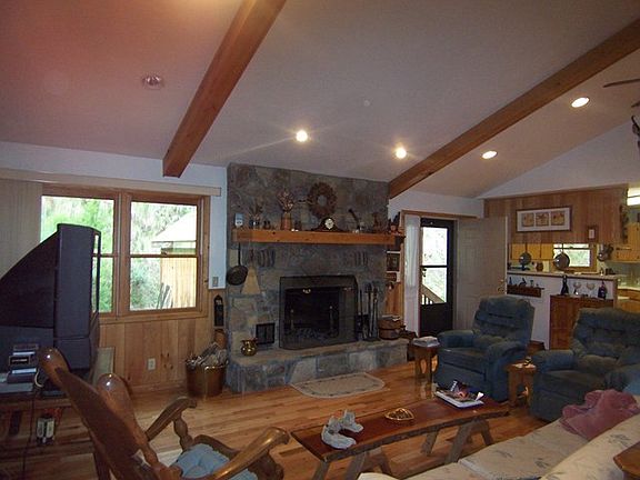 JUST LISTED - This wonderful cabin sits on 4.61 acres with an open floor plan. The large den/kitchen/dining room has a stone woodburning fireplace with two bedrooms on the main level and laundry room. NO STEPS REQUIRED. There is an additional room for guest and bath in the basement level, with a garage and workshop . Large covered porches add to your outdoor living. The property also has a level area for an RV, complete with electricity, water and sewer. Private and in great condition, with easy access, great property for the money!!!