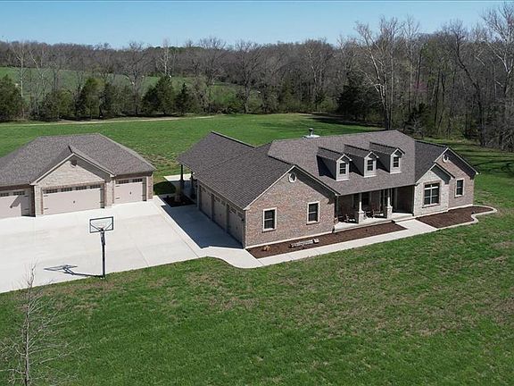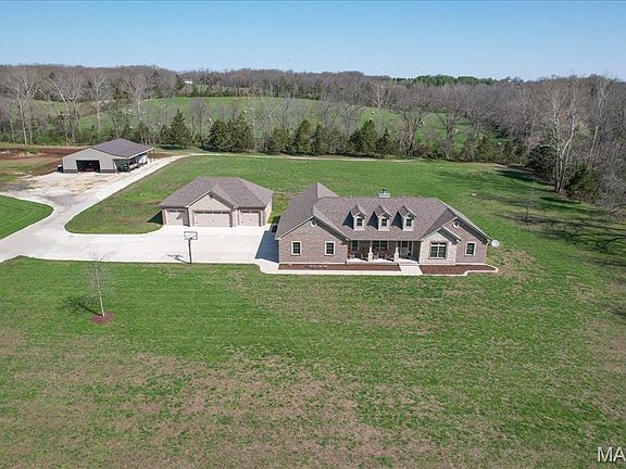 Looking for a newer build? Here is a builders ranch home on 10 acres with 4 bedroom, finished basement, 3 car attached PLUS a 4 car detached AND an outbuilding with lean-to, all on a beautiful private setting, convenient to I-44 and town. Come enjoy country living on the long front porch or enjoy the beautiful nights by sitting on the quiet, secluded, covered back patio. Home shows pride of ownership. Foyer is welcoming with this open floor plan. Luxury vinyl flooring is throughout the main floor. The kitchen has beautiful custom cabinets, granite countertops, large island, and adjoins the living room with a stone fireplace. Dining room is just steps away for family gatherings. Master bedroom suite has a custom tiled shower, double sink and a large walk-in closet. A second bathroom, 2 bedrooms, and spacious laundry room completes the main floor. The basement is finished with 4th bedroom, office, family room, rec room, exercise room and large storage area. You have it all. Must See!