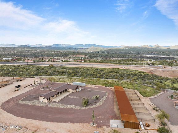 Nestled in Wickenburg's heart, this charming horse property offers a Western lifestyle. The main house, remodeled to perfection, features a spacious kitchen with an perfect island that awaits for casual dining or entertaining guests. a cozy living room with a fireplace. . The main house features 2BD 2BTH, providing plenty of space for both residents and guests alike. A laundry area with an office desk adds convenience.Outside, equestrian amenities abound, including eight covered pens, a large hay shed, and ample space for an arena 140x250. A separate casita provides additional living space with two bedrooms, two baths, and a well-appointed kitchen and dining area. The backyard patio offers stunning views and room for a pool as well. Beautiful landscaping. shared well ( #2 )