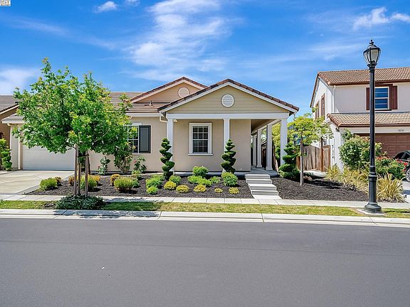Effortless single-level living meets modern efficiency at 1485 S. Perkins Place in vibrant Mountain House. Behind the sculpted front landscaping and welcoming porch, a sun-splashed open floor plan unfolds across wide-plank hardwoods. The entertainer’s kitchen steals the show with an oversized granite island, rich espresso cabinetry, subway-tile backsplash and pendant lighting—perfect for weeknight dinners or weekend brunch spreads—while the great-room layout keeps conversations flowing from the dining area to the chic living space beneath a crystal chandelier. Three restful bedrooms and two designer baths are thoughtfully arranged for privacy; the spa-inspired primary suite pampers with dual vanities, a frameless glass shower and soaking tub. Step through the sliding glass doors to a covered California room and expansive stamped-concrete patio bordered by lush planting beds—ready for alfresco dining, playtime or star-lit gatherings. Hidden upgrades elevate daily life: fully owned solar panels, tankless water heater, 2-zo heating & A/C, whole-house water filtration, EV-charger pre-wire in the oversized two-car garage, and hard-wired Ethernet in every room for lightning-fast WFH or streaming. Smart layout a single-story convenience make this the ideal home to live your best life.