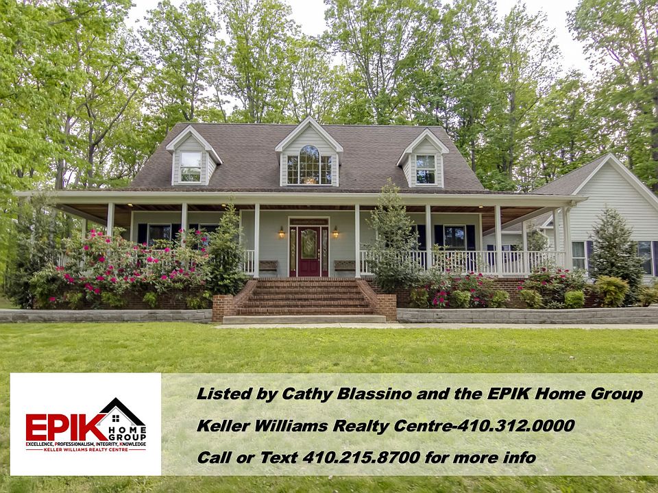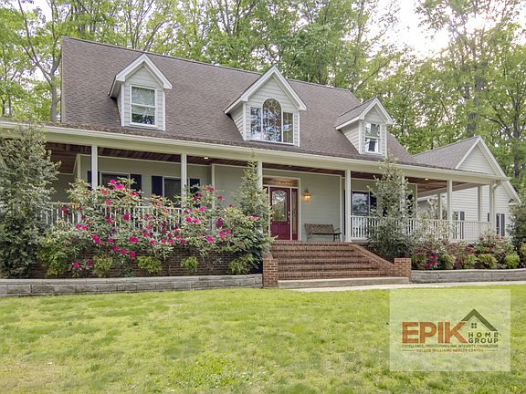 Car Collectors Dream! Absolutely gorgeous custom-built Cape Code with 5 bedroom, 4 full bathroom, 2 powder room, 3 attached garage and over 3000 square feet of living space. Plus you~ll find two additional detached garages with 6 bays! A huge, open 2 story foyer with marble flooring greets you as you enter and opens to a spacious living room with access to the wrap around front porch and brick 2 sided fire place. Stunning hardwood floors are found throughout the main level which includes a formal dining room and main level master suite with private bath and walk-in closet with custom closet system, office, 2 powder rooms and a large renovated kitchen with stainless steel appliances, beautiful cabinets and breakfast room with bay windows and French door that leads to an amazing covered, wrap around tiered deck for entertaining and large 4 acre lot with mature trees and private setting! The upper level includes 3 large bedrooms with huge walk-in closets and 2 full baths. Partially finished lower level features a 5th bedroom, 4th full bath, laundry room, storage and ample unfinished space for future living area with wood burning stove on a beautiful brick wall. This home is Turn Key and ready for new owners.