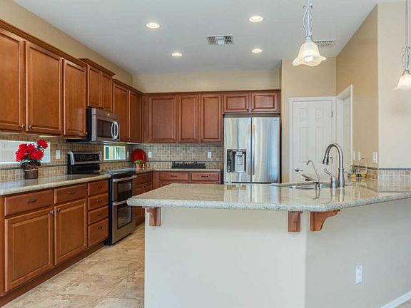 Excellent opportunity for you to get in to the prestigious Village at Litchfield Park. Sweet 3 Bed Home with open concept and split 3 car garage. Fabulous Kitchen with granite slab counters. Beautiful travertine back splash with metal bead inlays. Upgraded staggered cabinets. Sleek stainless double oven, microwave and dishwasher. Pendant lighting over breakfast bar. Brushed nickel lighting over the eating area. Neutral 18'' variegated tile and lush carpet. Grand Master Ensuite with crisp white shutters. Impressive Bath with stone counters and shower surround. Custom mirror and soaking tub. Computer niche leads to 2nd & 3rd Bedroom & 2nd full bath. Easy care desert landscaping with mature shade trees. Paver extended patio. Nestled in the Village with no neighbors behind! See it today!