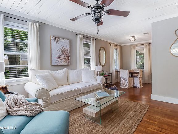 This charming cottage is just two blocks from the beach (not in a flood zone), a five-minute drive to downtown Biloxi, and a great 30-day rental history. Located in the golf cart district, you can easily cruise over to the White House Hotel for dinner! This property is being sold FULLY FURNISHED (some exclusions) so just pack your bags and move right in. As you walk in the living area, you will immediately notice the beautiful original hardwood flooring throughout, quartz counters, updated cabinets, stainless range oven and microwave (Gas hookup avail for range oven.) Updated bath with new tub/shower and subway tile surround. New metal roof in August of 2023! New privacy fenced in back yard shaded with massive Oak trees and over 100 year old registered Magnolia tree in the front yard!