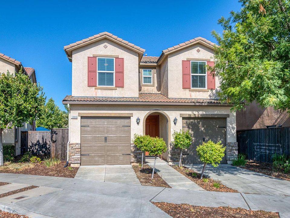 Welcome to 1486 N Dara, a standout home in the heart of Harlan Ranch located in a cul-de-sac and near trails! This charming 3-bedroom, 2.5-bath residence has been freshly updated with new paint throughout, including on the front and dual garage doors, and brand-new carpet. The open floor plan effortlessly connects the kitchen and living room. The kitchen features sleek stainless-steel appliances and convenient access to one of the one-car garages. Upstairs, you'll find all three bedrooms, along with a laundry closet equipped with a stackable washer and dryer. The backyard offers a lovely patio. As a resident of Harlan Ranch, you'll also enjoy access to the community pool and clubhouse. Don't miss this fantastic opportunity!