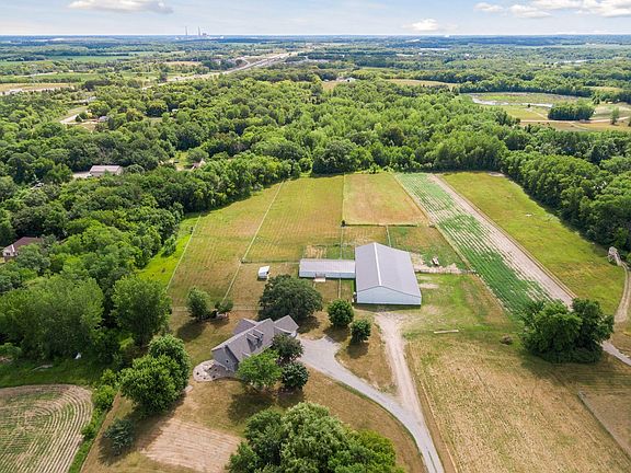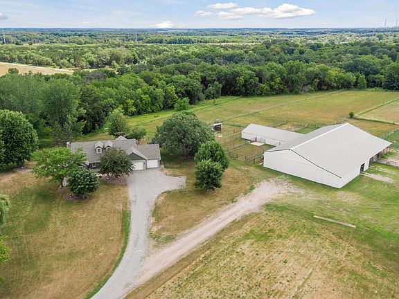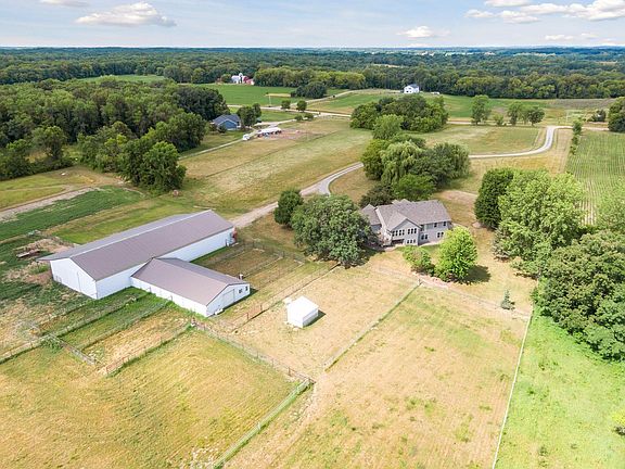 Horse Ranch Deluxe! Custom built rambler with just under 12 acres of pasture and hay ground. Buildings include 50 X 120 Indoor riding arena, 11 box stall horse barn(one double for foaling) with outdoor paddocks, individual waters in each pen, wash rack,tack room, and fly system. 3 outdoor automatic waters. 80 X 22 enclosed lean to storage for all your equipment with an additional 40 X 22 horse shelter lean to. The home has been updated with Cambria counters throughout, as well as roof and siding. Owners suite featuring walk in closet, 3/4 private bath. Main floor Laundry, formal dining, and 3 season porch on main level. Walk out Lower level is plumbed for a wet bar, 2 additional bedrooms, and large storage room. Air to Air exchanger, Kinetico water softener. Geothermal heating, and 250 amp service, make this home super efficient. Easy access to 94, close to town, and yet your own country acreage escape!