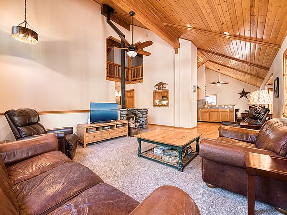 This four-bedroom, three-bath Tahoe vacation ski lease vacation home offers vaulted wood ceilings, large windows, and an open floor plan ideal for relaxing after a day on the slopes. The main living room features a wood-burning fireplace and Smart TV, flowing into a fully equipped kitchen with stainless steel appliances, gas stove, and a dining table seating eight comfortably. Off the kitchen is a family gathering room with a pool table and cozy gas fireplace, plus access to a covered deck perfect for winter dining or apres-ski gatherings.