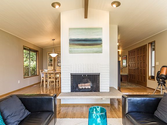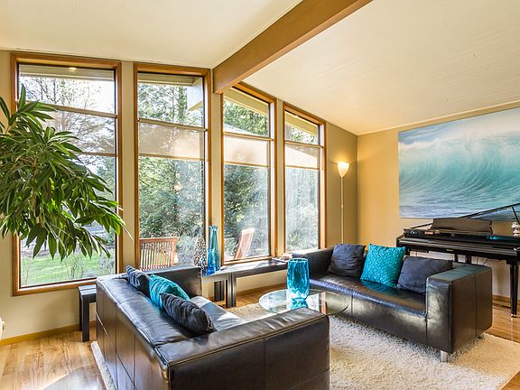 Beautifully updated modern contemporary home on a large private 1/3 acre lot is the perfect family home! Light and bright living room with floor to ceiling windows overlooking the expansive yard with mature landscaping & gorgeous wrap around deck. Enjoy the spacious kitchen with new butcher block counters, custom drawers with pull out shelves, hardwood floors & bay window. Spacious formal dining room with built-ins and gorgeous laminate floor is perfect for entertaining. Nestle up to one of three wood burning fireplaces or escape to the master suite with a soaking tub, skylight, lots of closet space, bamboo floors & updated bathroom. Downstairs bonus room with Murphy bed, kitchen area, fireplace & separate entrance could easily be dual living. Newer roof and high efficiency furnace. Separate laundry room with washer and dryer hook-up and convenient all in one LG washer/dryer in the master suite. Gorgeous yard with mature landscaping offers a tranquil setting with a water feature. Great location close to public transit, parks & shopping!