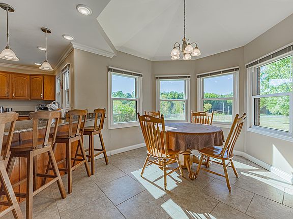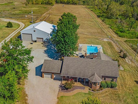 Set on 9 acres, this unique horse property offers the perfect combination of open space, modern amenities, and comfort for both people and horses. The 2,620 sq. ft. home includes 3 bedrooms and 2 full bathrooms with high-quality updates throughout. The kitchen provides abundant counter and cabinet space, granite countertops along with a cathedral-ceiling breakfast nook. Just off the kitchen is an oversized laundry room with storage closet, cabinetry, and room for an additional fridge and freezer. With 12-foot ceilings and hickory hardwood floors in every room, the home feels both spacious and inviting. The great room features a brick fireplace and connects easily to the formal dining room. The large primary suite includes a remodeled bathroom with double vanity, tiled walk-in shower with full body jets, and a walk-in closet. In addition, the primary bedroom has it's own HVAC system for perfect comfort while you sleep. Two additional bedrooms are good-sized with convenient access to the updated hall bath. At the back of the home, a sunroom with a wall of windows and doors overlooks the 18x30 saltwater pool and acreage beyond. The pool area includes a heater and chiller, new pool cover, pergola, Arctic Spa 8 person hot tub and outdoor wood-burning fireplace. Equestrian features include a 75x98 insulated and heated barn with workshop and storage, large stalls with ag-lime mats and auto waterers, plus an outdoor riding arena with its own auto waterer. The acreage is fenced and cross-fenced with trails for both horses and four-wheelers. Additional benefits include: whole house generator and REO electricity service for low utility costs.