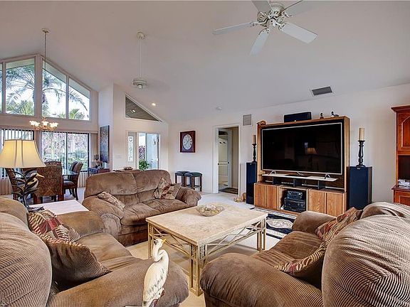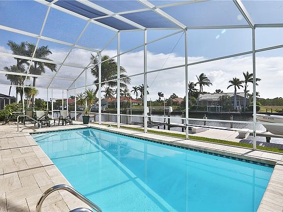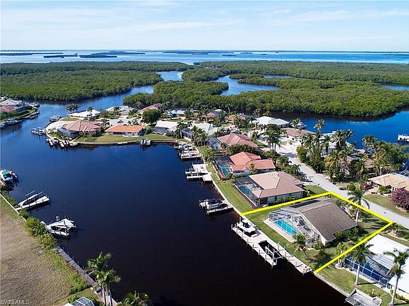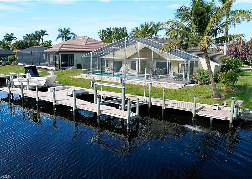The dolphin in the drone video is real! PALM ACRES, high ceilings, deep water, 100' new seawall, 165' across canal, expansive basin view, S exposure, 1,200 sq ft dock with PVC decking, 13k lb and 10k lb boat lifts. Only 8 minutes idle speed to the manatee marker in San Carlos Bay and 12 minutes to Sanibel Causeway via well-known short cut through tidal serpentine mangrove forested Shell Creek. Manatees, dolphins, eagles, osprey, herons, and pelicans daily. Catch tarpon, snook, and grouper from your dock. $70k dock, $41k kitchen, $30k seawall, $24k master bath, $22k pool deck. New roof, HVAC, pool heater, paver driveway, spare bathroom, tongue and groove cypress lanai ceiling, and overhead garage door. This is the waterfront boating fishing property in paradise you have strived for your entire life. Fruit trees include Key Lime, Naval Orange, and Avocado. Two vacant canal lots directly across the basin each recently sold in the range of $575k. Now that you see the value and understand the desirability, call now and come see.