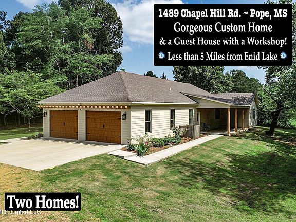 Gorgeous Custom Home & Guest House with Workshop! 2,900 Combined Sq. Feet with a Total of 4BR 3BA - Located minutes from Enid Lake, this property has an immaculate custom-built home and also a separate guest house with an attached garage workshop! The 2,000 sq. ft. main house has 2 spacious suites and was just built in 2020. It features a double garage, an open, split floor plan, a vaulted den with gorgeous wood ceilings, an enormous brick-floored walk-in pantry, granite kitchen counters, custom cabinets, & closed-circuit security cameras. The impressive master suite has a huge marble walk-in shower and a double walk-in closet that conveniently adjoins the laundry room. The guest room is extra spacious, too, and could easily work as an in-law suite. The 900 square foot 2BR 1BA guest home and shop was built in 2018 and is perfect for hosting company for weekends at the lake, use as a VRBO, boat and vehicle storage, or an awesome workshop for all kinds of hobbies. The garage door on the guest house makes it easy to store an extra vehicle or a boat, and there's still plenty of room for equipment. Live in the main house, and enjoy income from the guest house, or use them both for personal use. Great property with lots of options! Appliances: dishwasher and stove in main house and built-in microwave in guest house - Annual Taxes - $1,775 - Community Water with Liberty Hill Water Association - Two Separate Electric Meters - Private Septic Treatment Plant - ''Internet 25'' with AT&T - Electricity with Entergy - (Both homes are all electric, but propane is readily available in the area. )