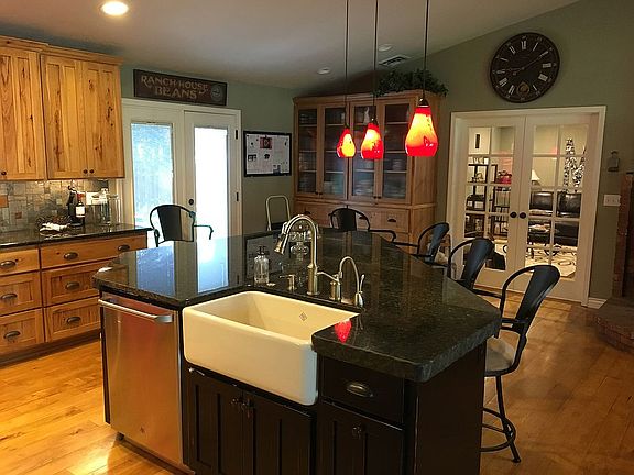 Single-story living space with a second-story attic space above the garage. It is a very open living space floor plan. It has a true gourmet kitchen with high-end appliances. Knotty maple floors complement custom hickory cabinets. Dark granite countertops and a farm sink complete the elegant kitchen.