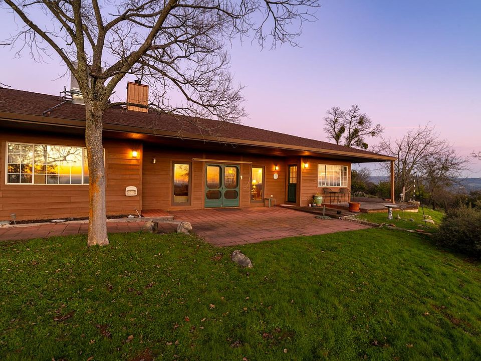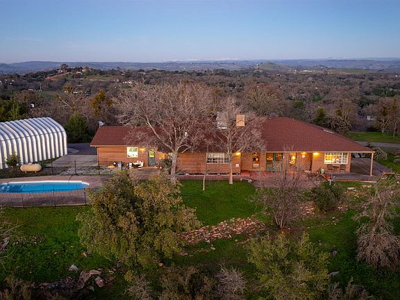 You would be hard-pressed to find a more magnificent 360-degree view in all of Amador County stretching all the way to Mt. Tamalpais in Marin and to the Sierra. This thoughtfully designed single-story home welcomes you through a tiled entry into a well-planned floor layout. The expansive step-down living room features wood floors, a soaring cathedral ceiling, and custom built-in cabinetry surrounding a striking stone fireplace with wood-stove insert. A separate dining room with built-ins is ideal for entertaining, while the kitchen offers abundant cabinetry and a generous dining area accented with wainscoting perfect for casual gatherings. The spacious primary suite includes a charming window seat with storage and direct deck access. The primary bathroom features dual sinks, a walk-in closet, and separate access to the deck and pool area. One guest bedroom includes a built-in desk and window seat with storage, and the guest hall bath offers dual sinks and a shower-over-tub. Situated on over 5 acres, the property includes an oversized attached garage plus an impressive 780-square-foot, 16-foot-high metal RV garage ideal for an RV, boat, multiple vehicles, or storage. Enjoy the fenced in-ground fiberglass pool for relaxing or entertaining, along with newer HVAC and an approximately 20 GPM well at time of drilling. Added bonuses include free internet service plus approximately $250 per month in income from an on-site internet tower. With over 300 acres of adjacent BLM land, privacy is assured. With great bones and endless potential for updating or remodeling, this ranch-style property is located in the desirable Willow Creek Ranch Estates offering peaceful country living with convenient access to Sacramento and El Dorado for commuters.