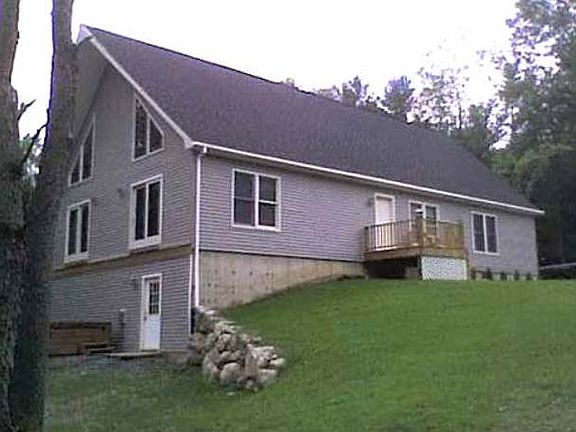 Spacious new Cape Chalet home on private wooded 6.6 acres. Bright living/dining area, high vaulted ceiling. Generously proportioned entertaining space! Kitchen has lots of counter plus large island allowing easy cooking & serving. 3 bedrooms. 2 large walk-in closets. Masterbath with soaking tub. Upstairs is third bath & large semi-finished family room that can be converted into fourth bedroom. Basement has 9 foot high ceilings & no columns. 6-8 person hot tub included. Class B trout stream at back. Excellent Condition, Condition-New