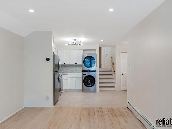 The home features hardwood floors throughout and a bright eat-in kitchen equipped with brand-new stainless steel appliances, including a dishwasher and over-the-range microwave and a garbage disposal. For added convenience, there's also a built-in washer and dryer right in the unit.