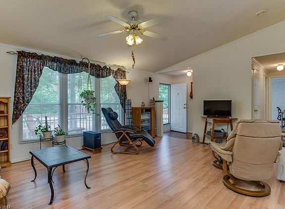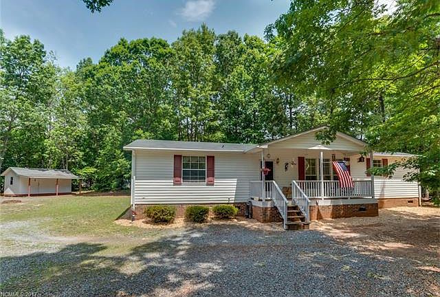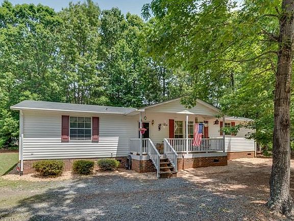 Immaculate DWMH on a large 0.82 acre wooded lot. New Trane HVAC 2015 & Roof New in 2011. Large Living Room & vaulted ceilings + Gas Log Fireplace separating it from Kitchen & Dining area. Kitchen has lots of cabinet space + center island. Split bedroom plan offers large Master Suite on one end + 2 add'l bedrooms & 2nd Full bath on the other. Laundry room off rear entry. Very nice covered front porch + rear deck are great areas to spend time entertaining or relaxing. Awesome 12x20 Outbuilding.
