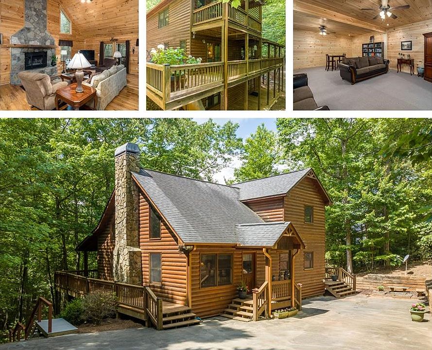 Escape the hustle and bustle in Mineral Bluff. Idyllic 3-story cabin nestled in the woods offers a home to relax and enjoy nature. Main level features open concept floorplan with kitchen complete with stainless steel appliances, granite countertops, and breakfast bar overlooking fireside great room with soaring ceiling, grand stone fireplace and dining area. Spacious bedroom on main level currently used as the primary suite along with a large bath featuring dual vanity, tub/shower combo, tile floor and laundry room. Upstairs boasts a large bedroom with walk-in closet and spacious ensuite with dual vanity, shower, large linen closet, tile floor, and private deck. Terrace level includes large flex space offering a variety of opportunities, ideal for combination of game room, hobby room, or entertainment room, another bedroom, full bath with tile floor, tub/shower combo, and storage room. All 3 levels feature decking with the main level boasting a wrap-around deck with space for a hot tub, upstairs features a private balcony, and the lower level is finished off with a spacious deck spanning the length of the home and overlooking the fenced backyard. Mineral Bluff offers a variety of outdoor experiences including hiking, fishing, camping, mountain biking, whitewater rafting, horseback riding, festivals, and is close to downtown Blue Ridge featuring shopping and dining. Chattahoochee National Forest, Toccoa River, Blue Ridge Mountains, Amicalola Falls State Park, wine vineyards, and orchards are all close by. A true destination a few short hours from Atlanta.