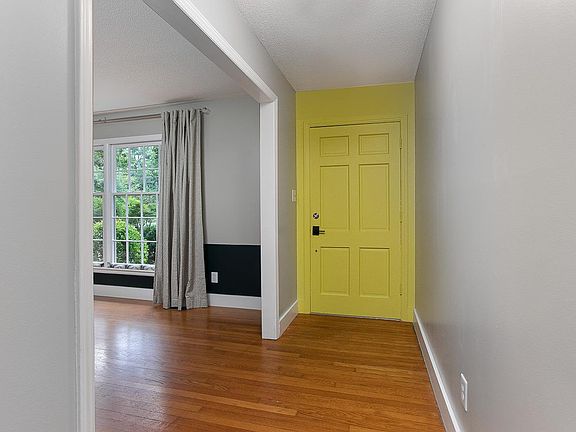 The kitchen features open shelving and connects to the dining room. Hardwood floors run throughout the living room and bedrooms. The bathroom is Jack & Jill style, with 2 private sink areas and direct access from the primary bedroom and the hallway.