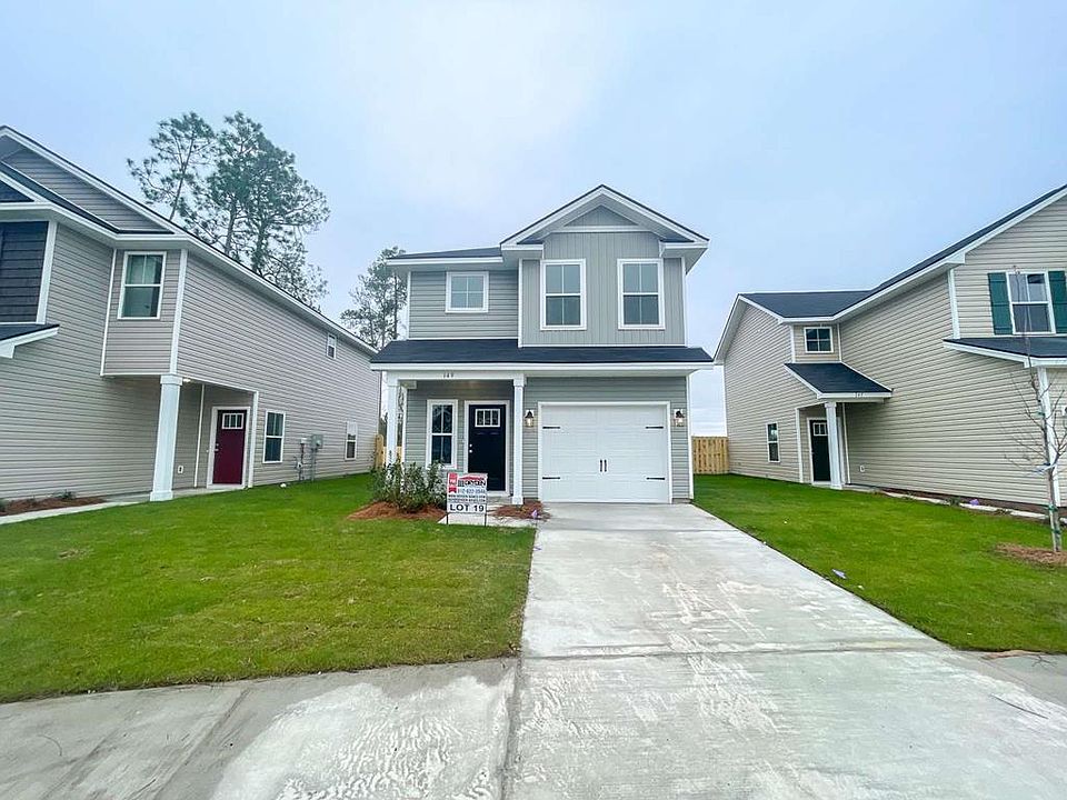 Kerry plan patio home located within Heritage Pointe just on the edge of Hinesville- just minutes to Ft. Stewart Main Gate or gates off Old Sunbury Rd. & Olmstead Dr. Also a quick commute to I-95 or Hwy 17! Two-story patio home with open living space on the first floor & all bedrooms upstairs! From the foyer entry venture further into the home's open concept living space. A welcoming great room with clear view from the kitchen to the family room & dining area. Views out to the backyard can be seen from the family room & kitchen. The backyard is fenced with sod & irrigation! Granite counters & stainless appliances in the kitchen, too! Upstairs are 2 bedrooms, hall bath, laundry & master suite! Master includes vaulted ceiling, 2 walk-in closets & private bath with dual vanity!
