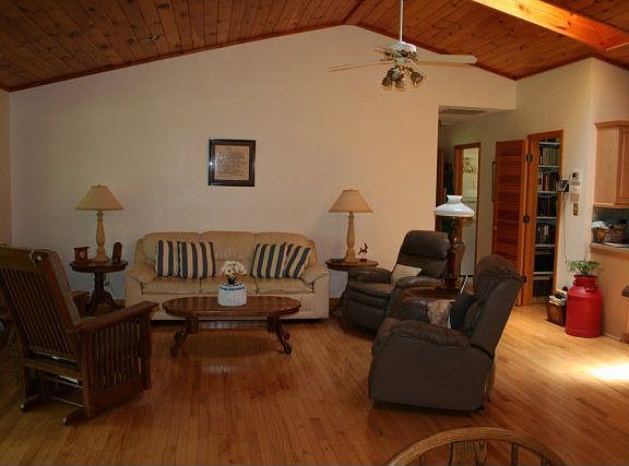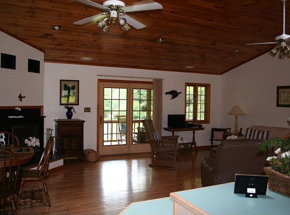 Great home close to town on 3.2 acres at end of drive, peaceful one level living, southern exposure with mountain view. Spacious covered deck w/porch swing. Open floor plan and vaulted tongue and groove ceiling w/skylights provide the perfect space for entertaining. Spacious master bedroom w/lots of natural light. 3/4 country maple hardwood floors. Peachtree French doors and double panel casement windows. Vermont Castings wood stove in LR with marble hearth. In line water heater, Hunter ceiling fans. Outside, enter circular drive to double carport with workshop. Listen to Branch outside Master Bedroom window. Enjoy all the beautiful trees and even blueberry bushes. Easy winter access.