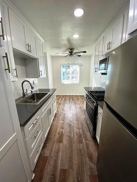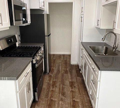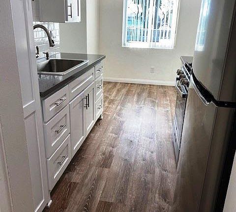 Completely remodeled 2 bedroom 1 bath just walking distance to downtown Fullerton. This 2 Bedroom apartment has been completely remodeled with new hardwood flooring and carpet throughout, new paint, new quartz counter top with a farmhouse style stainless steel sink and new stainless steel appliances including a refrigerator. This unit also includes a private 2 car garage with automatic garage door. The apartment building is a 7 unit apartment building with a shared laundry room and parking just steps away from the apartment. The location is tucked next to Fullerton high school on a nicely maintained street with single family houses and plenty of street parking. It is a 5 min walk to downtown Fullerton. Owner pay for water. Tenant pays for electric, gas, cable and internet. One small dog (15lbs) and under permitted. There is a non-smoking property. Income qualification - 2.5X Rent On approved credit. No contact virtual viewings can be done on the apartment if so desired. Upon approved application we require a credit and background check, verification of employment/income, 2 months bank statements, driver license or ID for identity verification.