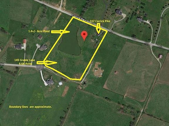6.64 +/- acres. Selling existing partially renovated home as is. Could also make a wonderful setting for your new home. Includes a 1.5+/- acre pond. The lot is cleared and gently rolling. Horses are welcome. Partially fenced. End of road on cul de sac, backs to farms. Road frontage on both Grable Lane and Carrick Pike but entrance is off the end of Grable Lane. The address for the house on the property is 337 Carrick Pike, Georgetown, Ky 40324. The physical address of the lot is 149 Grable Lane. Great location, being close to Lexington and Georgetown. Country living located minutes from interstate, restaurants and shopping. Only one house allowed so, fix up the existing farm home or clear the slate for your estate home.