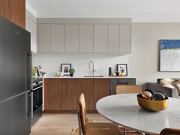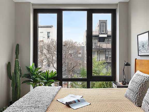 Be the first to Rent this owner-occupied, true 1-Bedroom, 1 Bathroom Greenpoint Condo in an Elevator building with Floor-to-Ceiling Windows throughout. Offered Furnished or Unfurnished with a Flexible move in date. Be greeted by a striking brick and steel facade, ascend the elevator, and enter into your tranquil condo with Floor-to-Ceiling, North-facing views. Looking out at the peaceful gardens of Greenpoint, create a meal in your spacious, open, and stylish mid-century Modern inspired Kitchen. With stainless steel appliances, practical and wide Quartz countertops, matching backsplash, and an extra-deep stainless steel sink. You'll be at ease when preparing culinary delights or entertaining guests. Custom walnut and matte laquer cabinetry offers endless functional storage space to tuck all your cooking accoutrements and gourmet products away. A vented range provides a fantastic and functional luxury rarely found in new developments and appeals to real chefs. Bathrooms are awash in large format limestone tiling, and also include blackened steel fixtures, extra deep soaking tubs, custom walnut vanities with spacious medicine cabinets, and unique Art Deco-style lighting. A large utility closet includes your very own garbage chute. In-Unit Bosch Washer & Dryer, wide plank oak floors, recessed lighting, and Daikin heating and cooling systems with multiple zones. Custom California Closets and Blackout shades from Shade Store are two of many upgrades by the live-in owners. 149 Green is a rare breed of building. Small and intimate with an inspired and unique design on a fantastic block, featuring an Elevator and both leafy green and waterfront views. A ButterflyMX video keyless entry system allows you to grant entry to yourself and others from your phone, and allows packages to be picked up and delivered. There is also a large bike room on the main level for ease. Close to the shops, amenities and restaurants -- both cutting edge and comforting -- of Greenpoint and Williamsburg. Greenspaces include Transmitter, McCarren, and McGolrick Parks. Just one block to the Greenpoint waterfront, from which you can access the ferry at India Street to reach Manhattan with ease. The G train at India Street is a 3 minute walk. Midtown Manhattan is a 22 minute commute door to door.