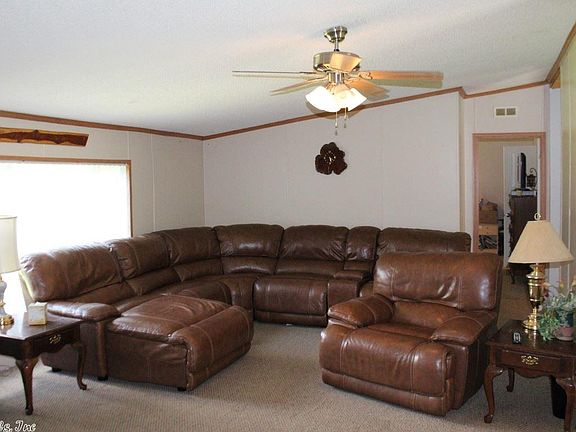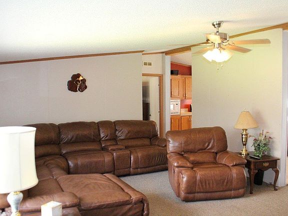 This property is a large manufactured home situated on two beautiful acres. The home has a cozy family room with neutral carpet and a ceiling fan leading to the eat-in kitchen. The spacious kitchen offers abundant cabinetry, an island and a built-in buffet in the eating area. The master suite boasts a jetted tub, a walk-in shower and dual vanities. A second living area offers a fireplace and ample natural light.