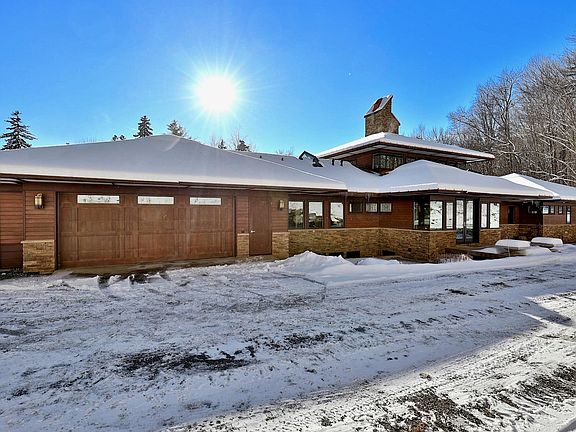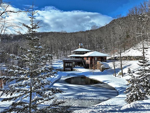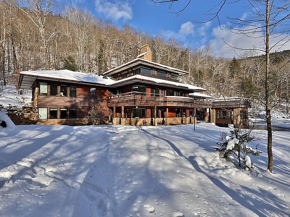 Wright Way, a majestic four-bedroom, four-and-a-half bath home, began as a dream to reflect the brilliant architecture of Frank Lloyd Wright. It took five years for this prairie style masterpiece to emerge, showcasing horizontal lines, open spaces, and natural materials. The elegant foyer leads to an open floor plan adorned with polished hardwood floors, skylights, and floor-to-ceiling windows. The living area, spanning 40 feet, features a grand double-sided stone fireplace and a mohair rug woven in Tibet for the owners—designed to resemble the carpet in FLW’s Robie House. The library is walled with built-in bookshelves. The south wing houses a gourmet kitchen with large windows and a unique breakfast bar. In the north wing, the primary bedroom provides a tranquil space with rich woodwork, gas fireplace, opulent bathroom, and walk-in closet. Guests are captivated by the three-story blue glass staircase which pays homage to FLW’s Falling Water and leads to the loft with 360-degree views. The lower level comprises three en-suite bedrooms, a wine cellar with tasting room, a bar and game room, and a exercise room plumbed for a future stationary pool. "Annie’s Cozy", a delightful three-season porch, suspends over the pond. Set on four-plus acres surrounded by hiking trails, the property is halfway between Killington and Okemo, close to lakes, and a short drive to Woodstock. This distinctive residence is within the Hawk Resort community, “where privacy is the ultimate luxury.”