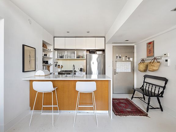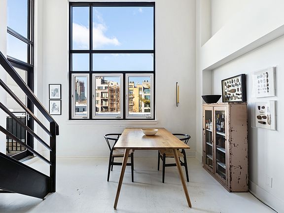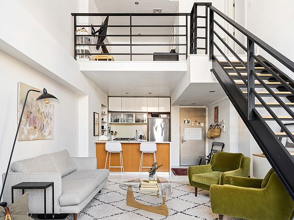 Coveted northern exposure and contemporary high-level duplex loft with soaring 15' ceilings and unobstructed views; 2-bedrooms + home office (convertible 3-bedroom); 2 full bathrooms; two private outdoor spaces; chic white hardwood floors; chef's kitchen; washer/dryer; and a deeded parking spot. This home really does have it all. This spacious and sunny home features a lavish open living area, premium craftsmanship, and quality finishes. Wide plank white oak flooring throughout, energy-efficient windows, with a custom designer kitchen add to the appeal. The white Aria Quartzite countertops, ample cabinetry below, provides a spacious workspace for the chef and a pleasing breakfast bar for guests. Stainless appliances blend seamlessly with the cabinetry. An intimate 5-story elevator building with just 30 residences, The Mondrian in prime Greenpoint is the perfect boutique condominium to call home. The building amenities include a keyed fob access, fitness center, bike room, sprawling landscaped common outdoor deck with grills, and private parking. Walking distance to East River waterfront, Greenpoint's main shopping area on Franklin and Manhattan Avenues, The Mondrian is just minutes from Manhattan and only a short walk from Williamsburg and Long Island City. A 421a abatement expires in 2024. Private Deeded Parking Space sold with Unit #4D