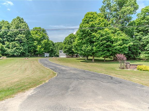 Welcome to this one-of-a-kind two-story contemporary home, set on 5.5 acres of beautiful, park-like grounds. Nestled back from the road and surrounded by mature trees and greenery, this property offers privacy, space, and comfort all in one. Inside, the home features a unique and versatile layout with 5 bedrooms and 2.5 baths, including a convenient first-floor bedroom. The large, open kitchen offers abundant cabinetry, massive counter space, and plenty of room for entertaining. A dining area flows seamlessly into both a main living room and a second living space, while the finished basement provides even more space for gatherings, hobbies, or relaxation. Upstairs, you'll find additional bedrooms plus a bonus area that can serve as a 6th bedroom, office, playroom, or dream space to suit your lifestyle. The first-floor laundry adds extra convenience. Step outside to enjoy a spacious deck perfect for summer evenings overlooking your private wooded backdrop. The property also includes an attached garage, detached garage, and shed, offering excellent storage for vehicles, tools, or recreational equipment. This home combines space, character and a serene setting-perfect for those seeking both comfort and privacy.