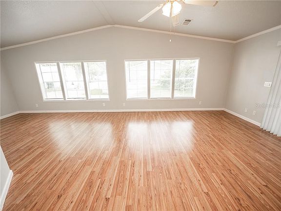 Spend your days fishing on Lake Mariana and experience a quiet, relaxed lifestyle in the cozy community of Marianna Park, a 55+ mobile home community with NO lot rent. You own the land! This home has been beautifully renovated with textured walls, neutral paint and laminate wood flooring thoughout, divided bedrooms and tons of storage. This spacious 2 bedroom, 2 bath manufactured home was built in 2000 and offers a bright and open floor plan with 1350 sq ft of living space. The living room is massive with expansive cathedral ceilings. Perfect for the cook enthusiast, the kitchen has plenty of cabinets and counter space with a breakfast bar open to the dining room area. The private master suite features a walk in closet and generous bathroom space with a dual sink vanity and walk in shower. Other features include an inside laundry room with a washer and dryer, spacious ceilings, large screened lanai and a 2 car carport. An attached exterior utility room provides all the space you'll need. The community offers a private boat ramp, shuffleboard and many activities at the community clubhouse such as bingo, pool table, cards or enjoy a potluck meal. There's also a secured storage area to park your boat or RV. The location is perfect for easy access to anywhere in Central Florida and shopping is just a short commute.