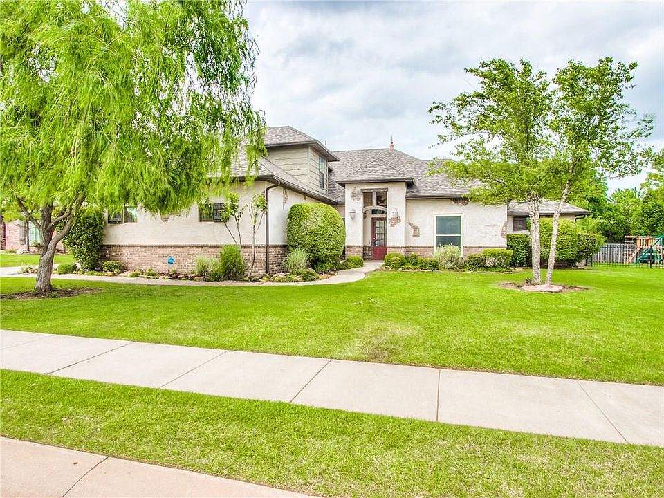 Check out this gorgeous home in the private, gated community in the Villages at Stonebridge. So many features to this home that include: May 2019 roof and guttering, storm shelter, a true mother-in-law suite with private front door entrance into a living area with a full bathroom, walk-in closet, and bedroom with private patio area. The home also features stained concrete floors that provide an elegant and luxury feel. The kitchen features granite countertops, a gas cooktop, built-in oven and microwave, dishwasher, stainless vent hood, large kitchen island with pendant lights, and pantry complete this kitchen. The master bathroom features double vanities, jetted tub, walk-in shower with glass door, recessed lights, and spacious walk-in closet. The home also features a formal study and spacious upstairs bonus room with ½ bathroom that could easily be a media/game room or bedroom. Both refrigerators, washer and dryer, and all mounted TVs remain with the home. Definitely a must see.