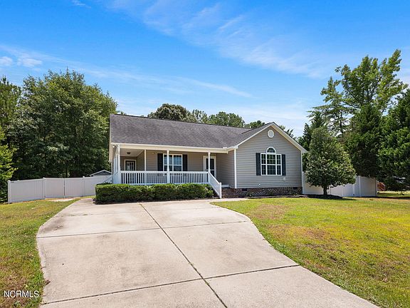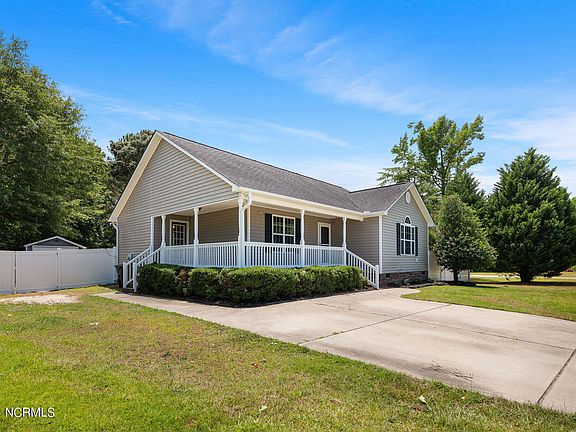 Move-in Ready Ranch Home in the Most Desired Princeton School District ~Wrap Around Country Front Porch~ Walk into your Large Family Room w/ Gas Log Fireplace & Cathedral Ceilings~ Sunny Island Kitchen w/ Stainless Steel Appliances ~ Dishwasher, Refrigerator & Pantry ~ PLUS Ample Cabinet Storage & Counter Space ~ Dining Area off of Kitchen~ Nice sized Owners Suite with walk in closet, dual vanity & garden tub! Gorgeous backyard with wooded Buffer & three sided white vinyl privacy fence - only needs the rear fence to be fully fenced~ Rear Storage Sun Deck PLUS Outbuilding! Convenient location just off of Highway 70 making an easy commute to Seymour Johnson Air Force Base and Raleigh