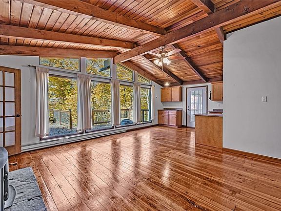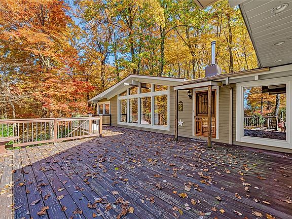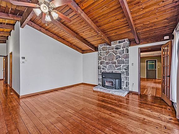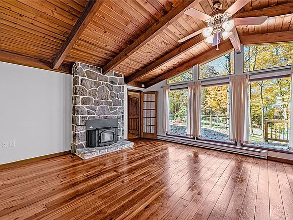 This ranch style mountain house is nestled on 5.5 private, wooded acres at the end of the road. Features include an open floor plan, wide plank wood flooring, vaulted ceilings, living room with stone fireplace, large family room with wood stove, home office or 4th bedroom, 1st floor laundry, a sunroom, a newer oversized 2-3 car garage with 2nd story storage, an expansive deck ideal for entertaining, a carport and more. This is the ideal retreat or year-round home. Dont miss this one!