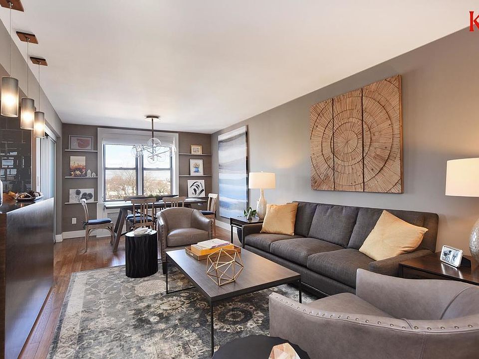 Bay Ridge Jr 4 co-op offers perfection with style. This Top floor corner apt has 3 exposures including NYC skyline views. This sunny apt has been totally remodeled with architectural plans and the use of an interior designer. The open layout kitchen has white & grey cabinets glass subway tile backsplash, silestone countertops, garbage disposal and Kitchen Aid stainless steel appliances. The pass thru is great for entertaining in a spacious dining/living room combo 236 x 115. Additional highlighted features include: recessed lighting, hardwood floors, hidden cable wires, new moldings, Roman shades & all custom designed closets. The flex or Jr.4 Room has 2 windows, unique opaque sliding pocket doors, which make this room usable for whatever space that you need. The newly created windowed bathroom has a large shower with lovely fixtures and a linen closet. The master bedroom is king sized and has an expansive custom designed closet. Building amenities include a live in super, laundry facilities on the ground level, security system, wait list for parking and a beautiful elegant lobby. The low affordable maintenance of $845 is highly attractive. This co-op is situated in the ideal location for conveniences of being only one block to seasonal farmer markets, supermarkets, local boutiques and a variety of Bay Ridges finest restaurants and cafes. Also, only one block to the scenic Shore Road Park where the express bus stops & 3 blocks to the R train. Easy access to the BQE and the Belt Parkway. Dogs are not welcomed