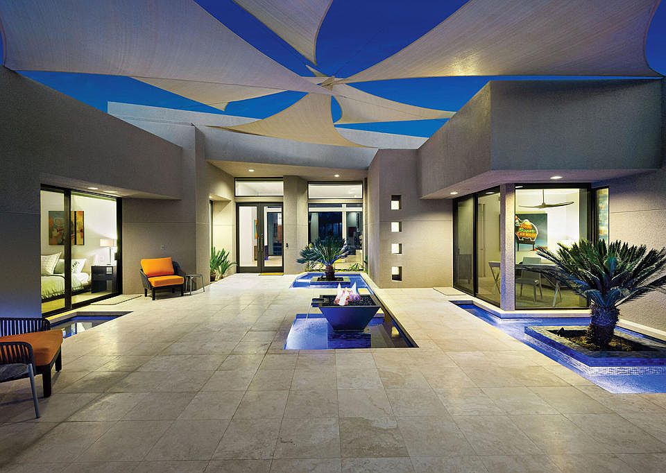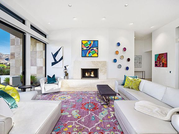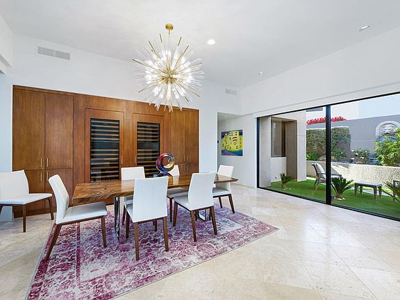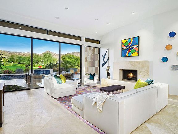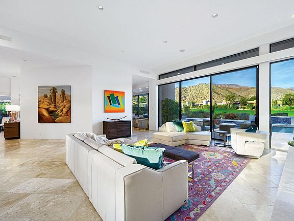 This bright and sunny home is your perfect size, whether for weekends or for all season long. Floor-to-ceiling glass throughout most of this home allows natural light all day long. Entry courtyard with sail canopies, water and fire features is a central focus with access by all guest suites. The living and family rooms all face out toward the golf course and mountains, while the dining room enjoys a view of the entry courtyard and side gardens. Three bedroom suites in the main residence and one separate detached guest house. Current improvements include full paid solar, new wiring to enable 'smart home' control of shades, door locks, thermostats, future cameras and lighting from an app, a/c in garage, whole-home water softener and filtration system and foamed roof. Offered furnished. Artwork on consignment and may be purchased separately.