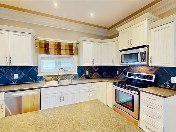 Slate tilePillar postsCrown moldingsGas fireplaceCappuccino hardwood floorTumble marbleCream victorian style cabinetry