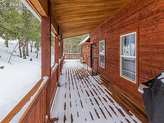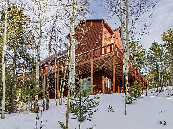 Here is the Mountain Retreat of Your Dreams! Nestled among the gorgeous aspen and pine yet only minutes to Woodland Park, this raised rancher invites you to experience the beauty of mountain living in modern style! Starting with the 360 wrap-around deck that shows off the natural beauty that is all around, this home impresses with its many wonderful features. The open-concept Great Room is a light-filled sanctuary, featuring twin French doors, luxury vinyl wood flooring, vaulted ceilings, architectural windows, and a captivating gas fireplace with rock surround. The Kitchen features a large center island with seating and abundant cabinetry and counterspace. The upper-level Primary Bedroom is a haven of tranquility, boasting a walkout to a private Juliet balcony, an adjoining bath with a double vanity, and a spacious walk-in closet. There is an adorable Loft Reading Nook overlooking the Living Room below. On the main level, two spacious bedrooms, a full bath, and convenient Laundry provide comfort and convenience. The lower level adds an extra layer of charm with a cozy Family Room warmed by a gas stove, an additional Bedroom with its own private entrance, and another shared full Bath. An oversized 2-car garage with a workbench conveniently walks directly into the lower level, enhancing both functionality and convenience. Ranch Estates is a beautiful subdivision with mountain scenes, forest views, and plenty of visiting wildlife. No covenants or HOA. This home offers a majestic forest setting that makes you feel miles away from civilization, yet it is just under 10 minutes from the amenities of town. Don't miss this excellent opportunity to have your dream mountain retreat in the woods!