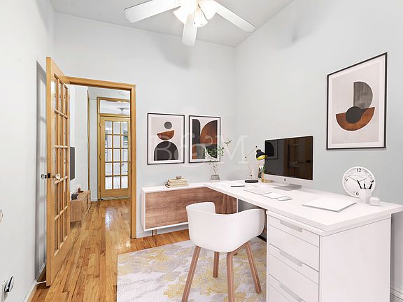 No Fee! Welcome to this charming 4-room home: a King-Size Bedroom, a Living Room, a Home Office, and an Eat-in Kitchen. You'll love these 10' high ceilings and large windows, French doors and hardwood floors, as well as ceiling fans in all four rooms. This dream location offers: a quiet, tree-lined street ideally suited for peaceful living and, at the same time, vibrant Graham Ave around the corner, offering some of the best restaurants in Prime Williamsburg. You'll find here multiple specialty shops and different services for your convenience. McCarren Park and Cooper Park are a short distance away! 3 blocks to Graham Av L-train and close to the G-train (Metropolitan Av). A 1,5-year lease is available. Pets accepted on a case-by-case basis.