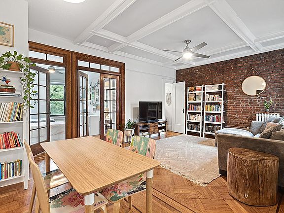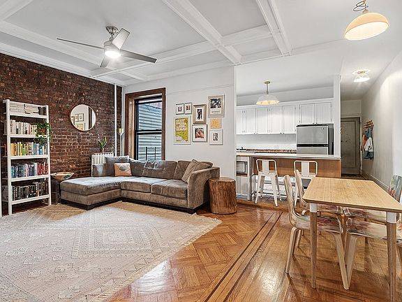 Located on iconic Prospect Park, this charming 2BR/1BA unit is sure to capture your heart. A long entry-hallway opens to a spacious flexible-use living and dining area, with gorgeous exposed brick, an abundance of natural light and enough room to grow and entertain. The adjoining, windowed kitchen has plenty of counter space for the aspiring chef and opens directly to the living-dining area. Wake to the sunrise in either bedroom, both with stunning park views, excellent closet space and additional storage. The windowed bathroom is pristine and features a newly glazed claw foot tub. This lovely unit has large closets in the hall and living room, beautiful parquet floors and windows on three exposures.