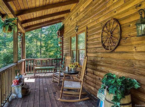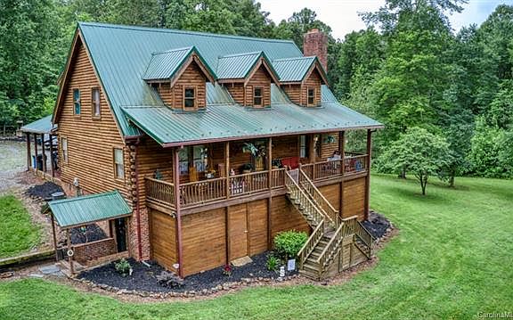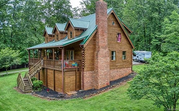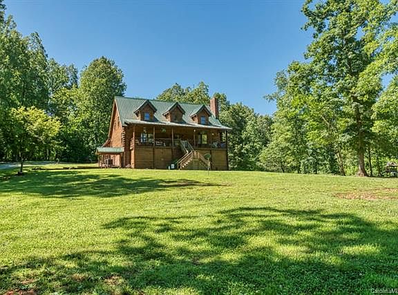 Rustic log home situated on 8.5 acres bordering the South Yadkin River; Gated gravel drive leads from wooded entrance to the home and then to the 3 car detached garage/workshop. The property also offers additional storage buildings. Covered front porch overlooks private yard. Inside the home you will find many custom features. kit features custom cabinets and all appliances; LR boasts 2story brick fireplace; MBR on main with His/Her WIC; MBA offers jetted tub/shower stall & dbl vanity; Large secondary BRs with WIC are located on second level; Open loft area overlooks LR; Laundry room is located off carport entry hall and features cabinetry and ironing station; BSMT boasts a game room with surround sound, work out room, office/craft room. Acreage is fully fenced to river. Outdoor entertaining includes children play area and also a Koi Pond. Sellers have left most of the acreage wooded. Log maintenance was performed in 2017. Tax value does not include finished bsmt nor garage/workshop.